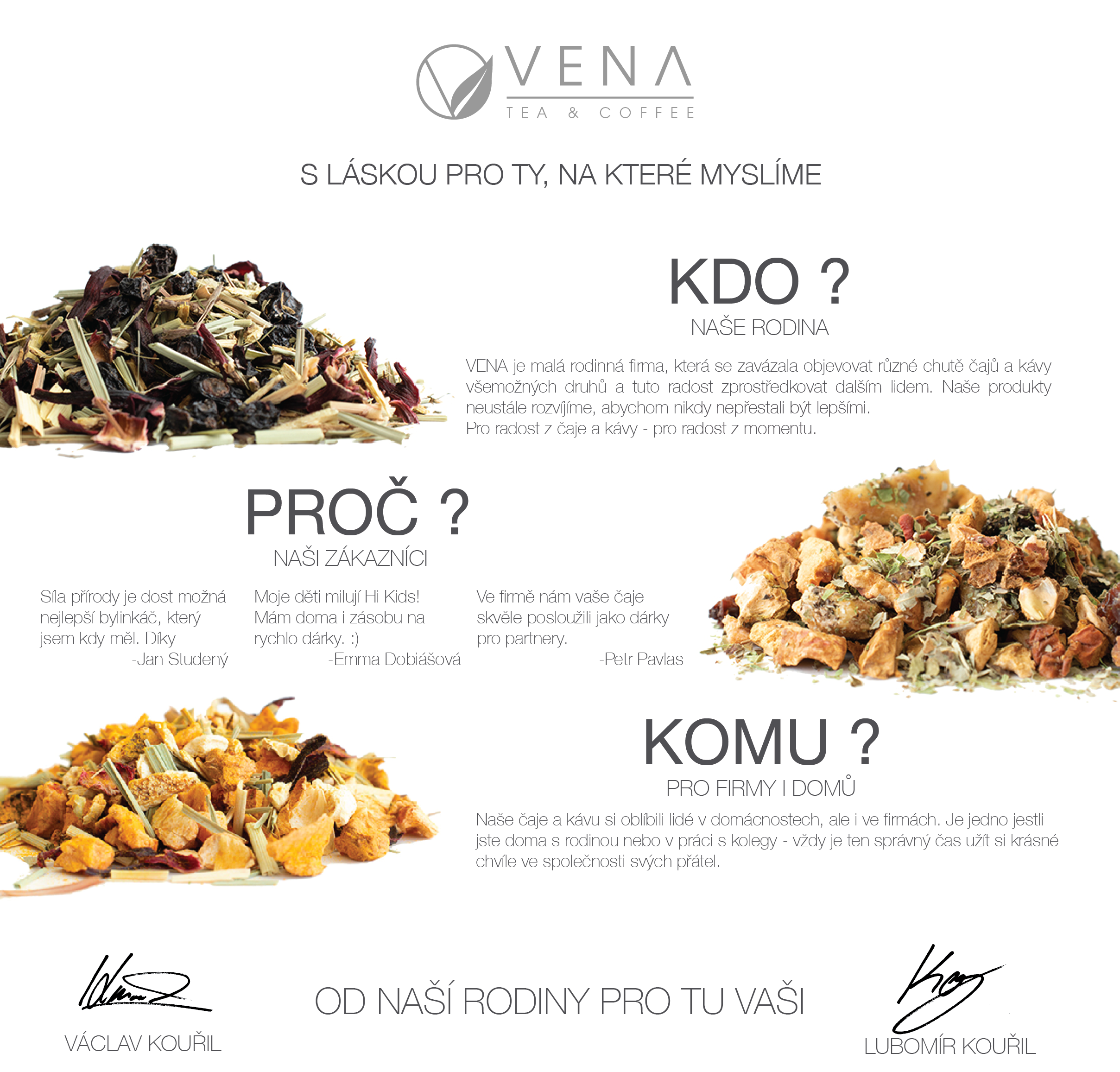 VENA je malá rodinná firma, která se zavázala objevovat různé chutě čajů a kávy všemožných druhů a tuto radost zprostředkovat dalším lidem. Naše produkty neustále rozvíjíme, abychom nikdy nepřestali být lepšími. Pro radost z čaje a kávy - pro radost z momentu.