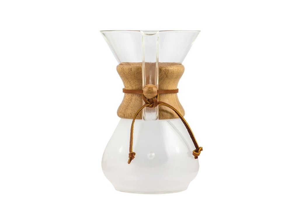 Chemex byl vynalezen v roce 1941 Dr. Peterem Schlumbohm. Design byl vytvořil na základě svých chemických zkušeností - od toho právě název Chemex. Tato jednodílná nádoba v tvaru přesýpacích hodin je vyrobena z vysoce kvalitního žáruvzdorného skla. Kolem hrdla je dřevěná rukojěť svázaná koženou páskou. Sklo, ze které je vyroben Chemex neabsorbuje pachy, a proto nemá žádný vliv na chuť kávy. Vyrobeno ve Spojených státech.
