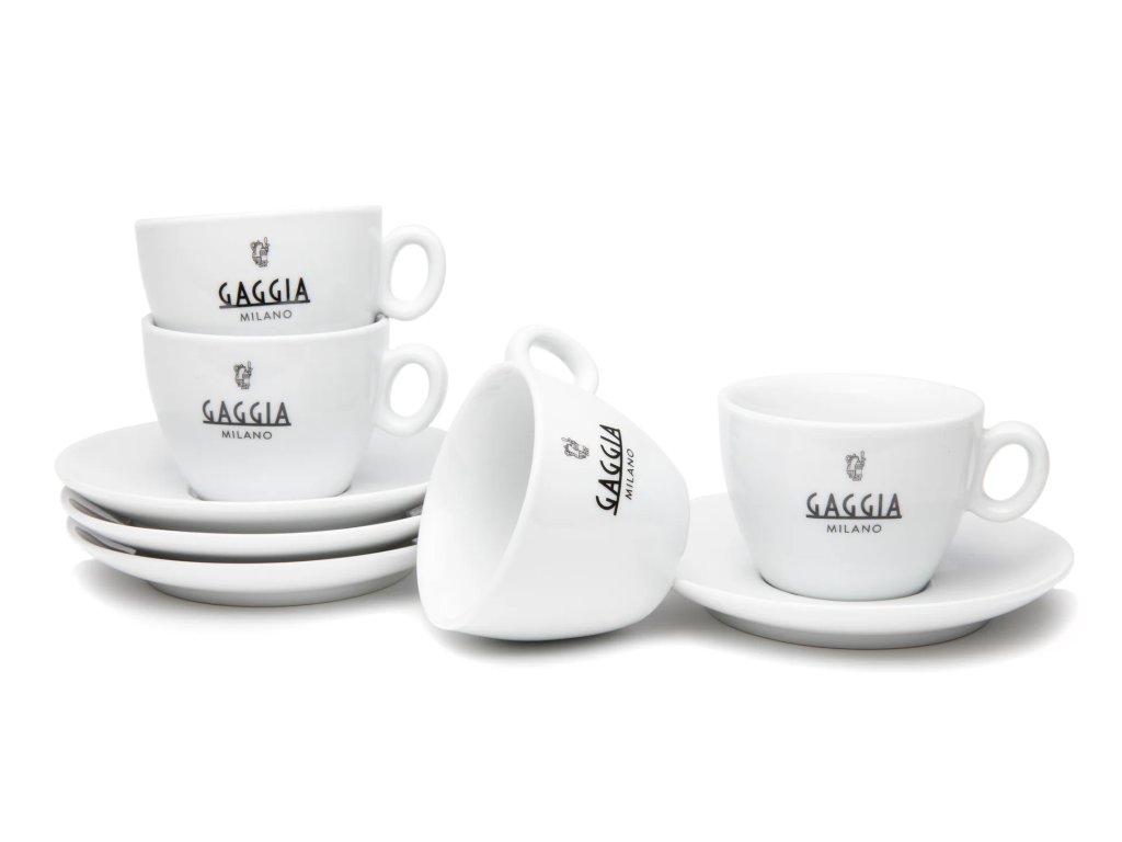 Čtveřice stylových černobílých šálků s podšálky zdobených logem Gaggia.