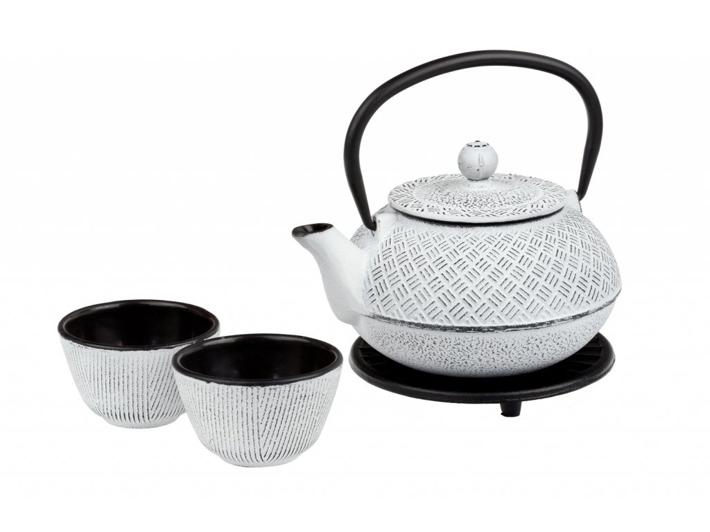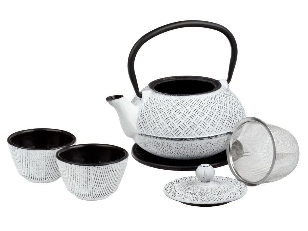 Litinová konvice o objemu 0,8 l s podložkou, dvěma miskami o objemu 0,12 l a nerezový m sítkem. Litinová konvice udržuje stálou teplotu, čaj si tak udrží svou svěží chuť i vůni po mnohem delší dobu.