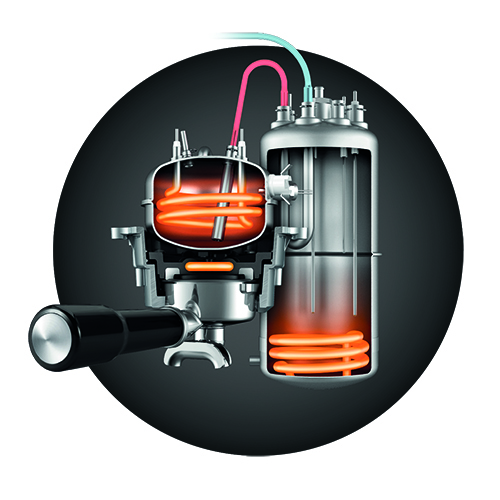 Srdcem tohoto přístroje je topný systém se dvěma bojlery. Bojler pro přípravu espressa je řízen technologií PID pro přesnou kontrolu teploty, zatímco samostatný parní bojler nabízí okamžitý a silný výkon páry na vyžádání. Díky tomu můžete extrahovat kávu při správné teplotě pro dosažení optimální chuti a současně s tím šlehat mléko.